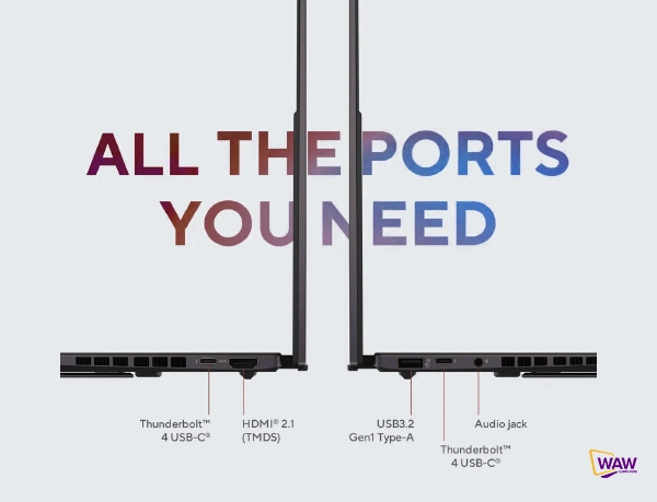 1x USB 3.2 Gen 1 Type-A (data speed up to 5Gbps), 2x Thunderbolt™ 4 with support for display / power delivery (data speed up to 40Gbps), 1x HDMI 2.1 TMDS, 1x 3.5mm Combo Audio Jack